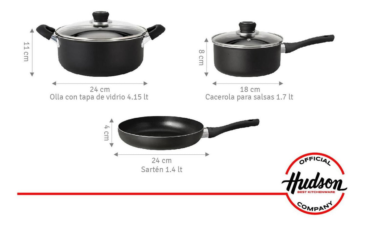 Si buscas una Batería que no solo sea funcional, sino también duradera y fácil de usar, la Batería Hudson con revestimiento antiadherente de Negro es para vos. Tres en uno: Olla de 24 cms + Olla de 18 cms + Sartén de 24 cms. + Bifera de 26 cms + Jarrito de 12 cms. En Hudson sabemos que cocinar es más que una tarea, es una forma de crear. Por eso, nuestros productos están diseñados para hacer que cada plato sea una experiencia.