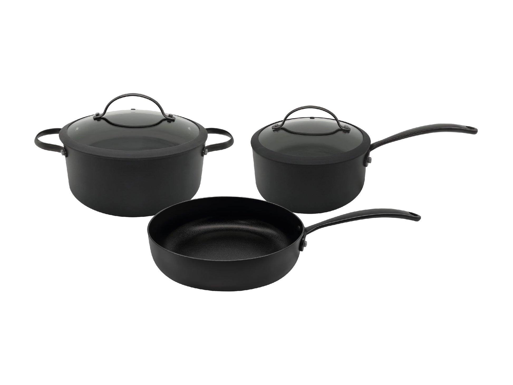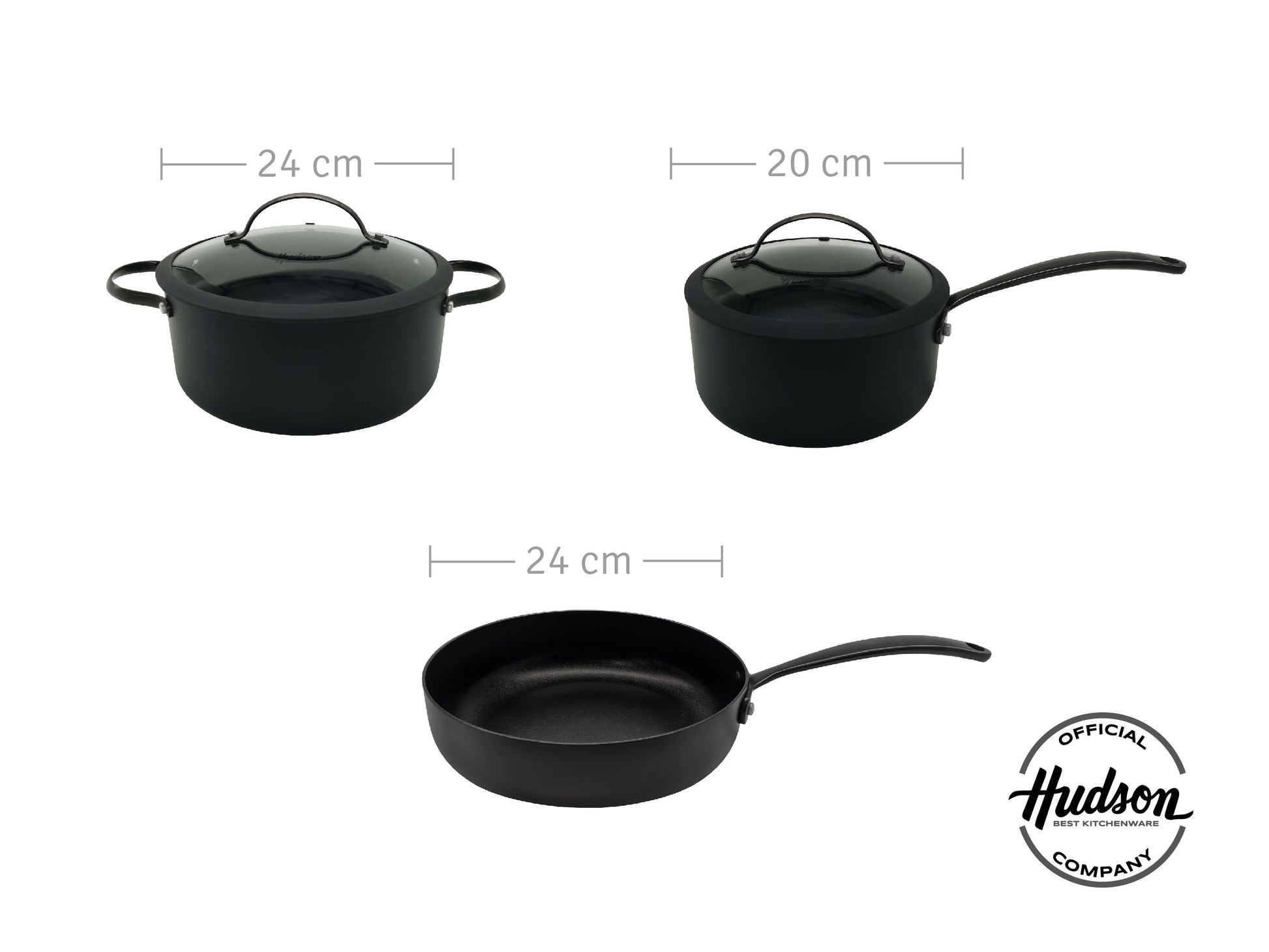 Esta compuesto por cacerola 24 cm diámetro con tapa de vidrio + cacerola 20 cm diámetro con mango y tapa de vidrio + sartén 24 cm diámetro. ¡La tapa de la olla la podes usar también en la sartén!