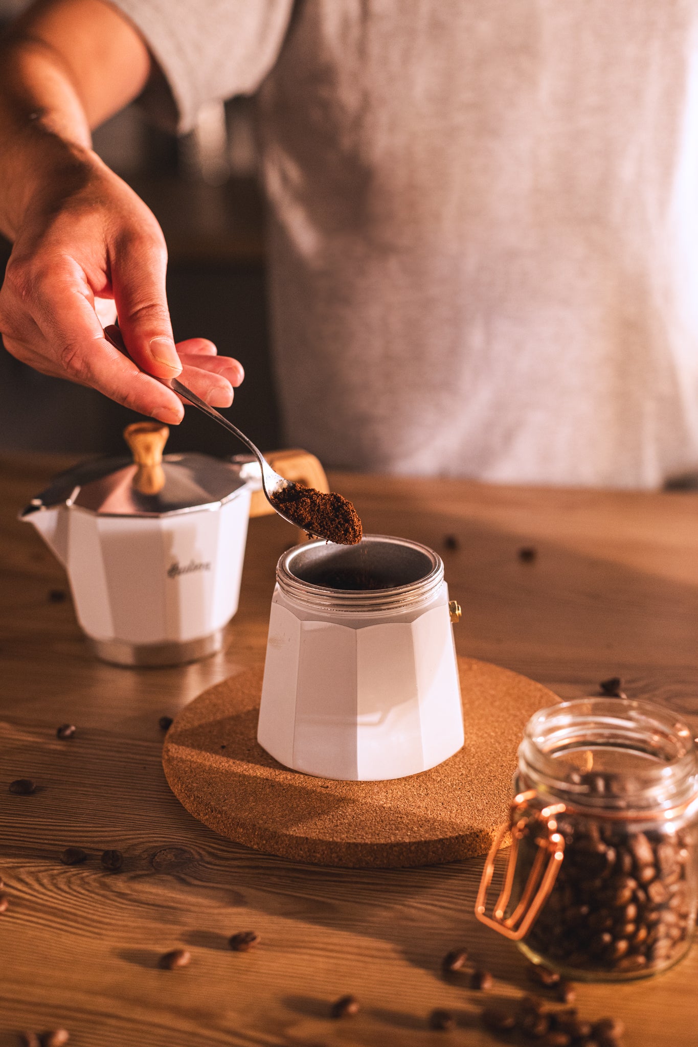 Simplemente desenrosca la parte superior de la cafetera, retira el embudo y coloca agua natural. Volve a colocar el embudo y rellénalo con café (sin presionar) hasta 1 cm antes del borde superior. Unir ambas piezas enroscando con cuidado y cerrarlo fuerte evitando que queden granitos de café en la rosca. Lleva a fuego moderado y listo!