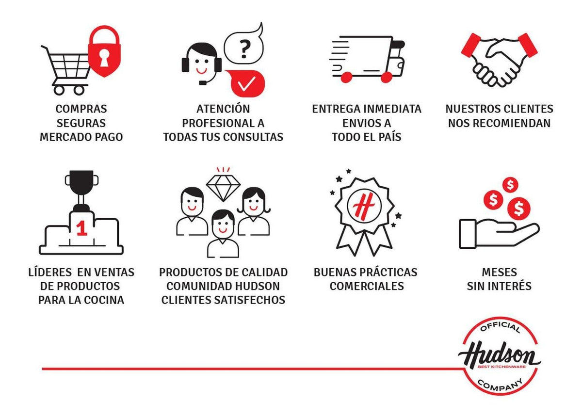 - Con el objetivo de equilibrar la distribución del calor y ahorrar energía, todos los productos Hudson cuentan con difusor de calor en sus bases. - Estos artículos tienen un recubrimiento múltiple por lo cual resisten muy bien la abrasión y los rayones. Sin embargo requieren mínimos cuidados para alargar su duración usando utensilios de cocina no metálicos y elementos de limpieza apropiados para este material.