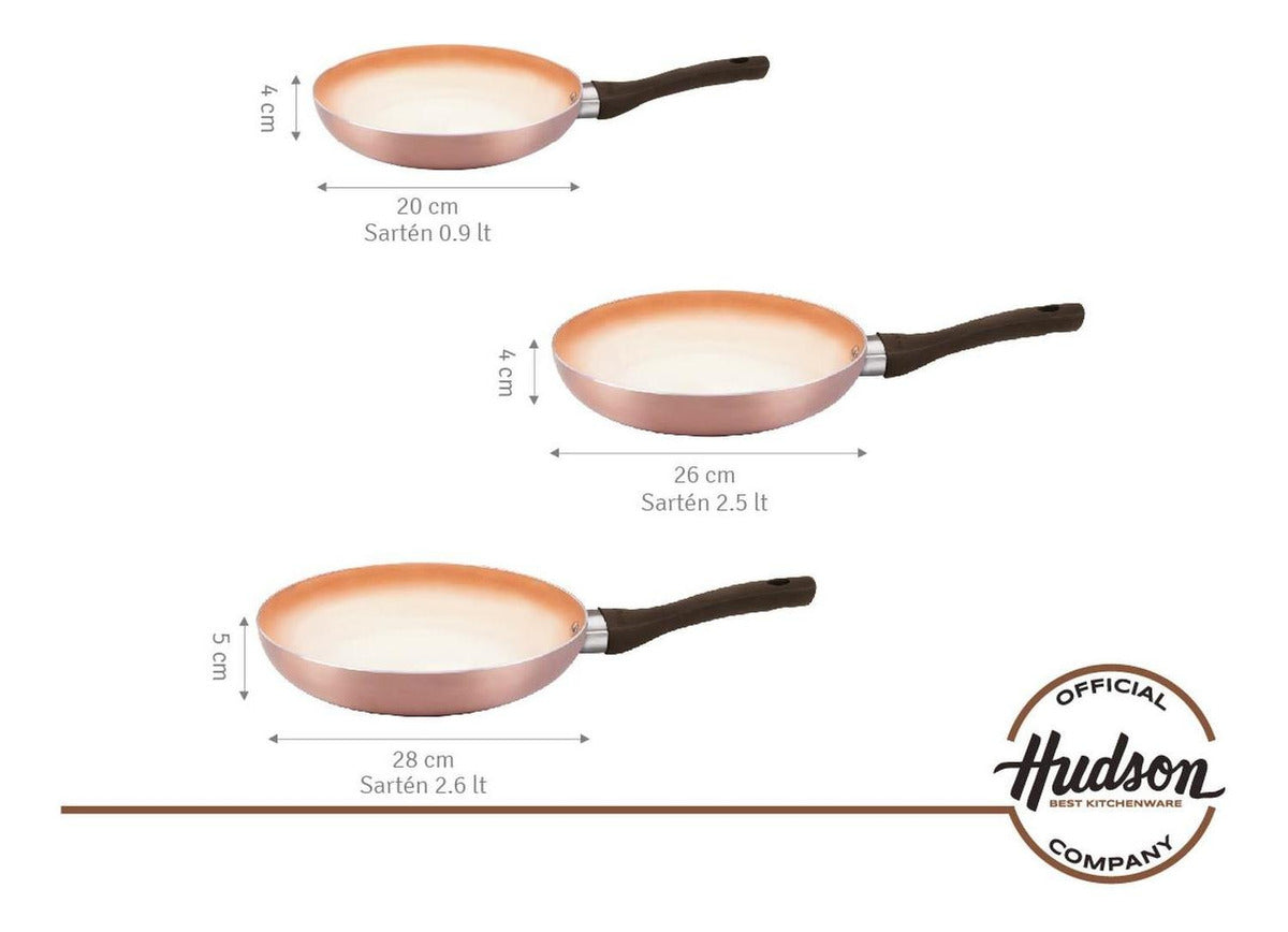 Comprando esta publicación obtienes una Set 3 Sartenes 20 cm + 26 cm + 28 cm Cobre Hudson. ¡Un básico para tu hogar!