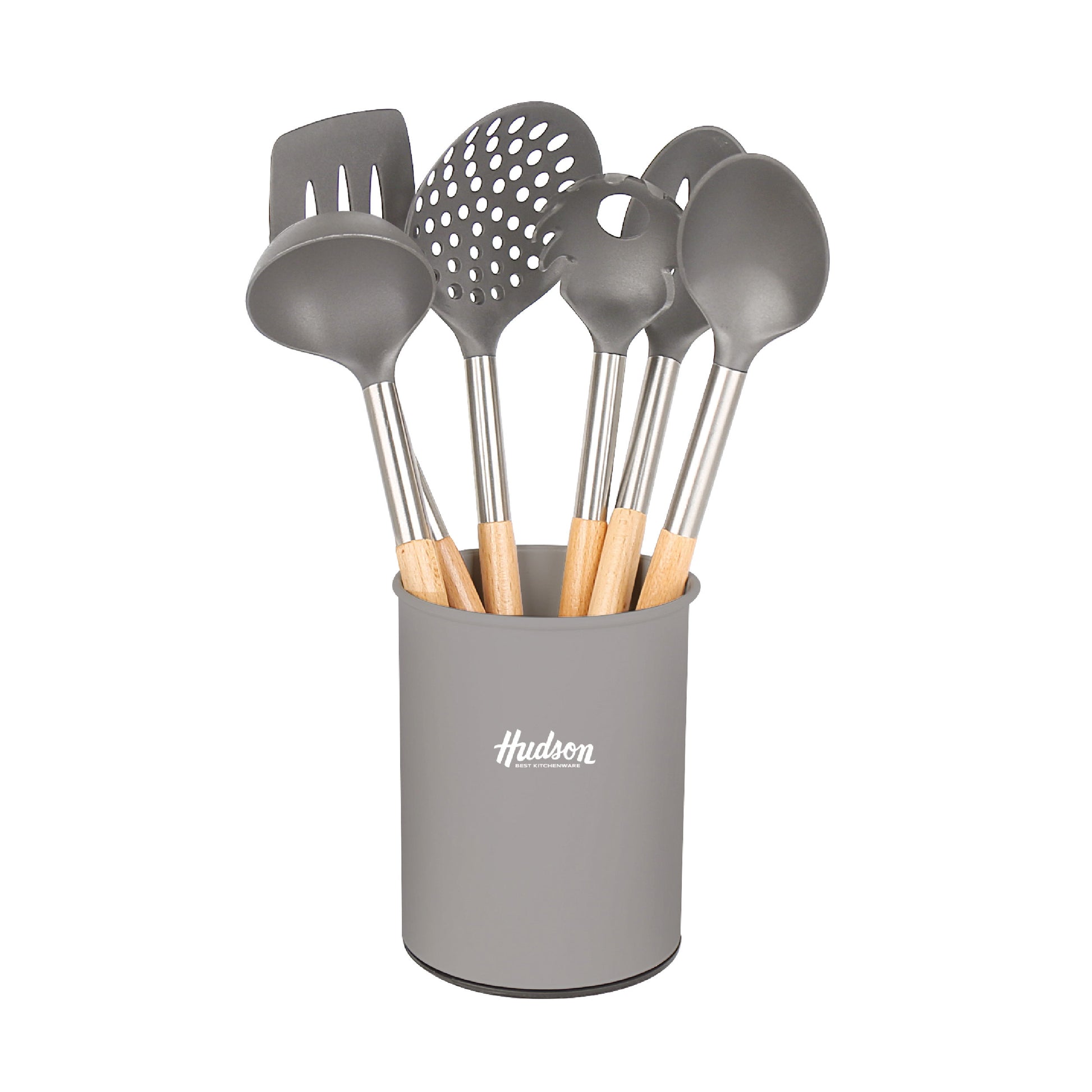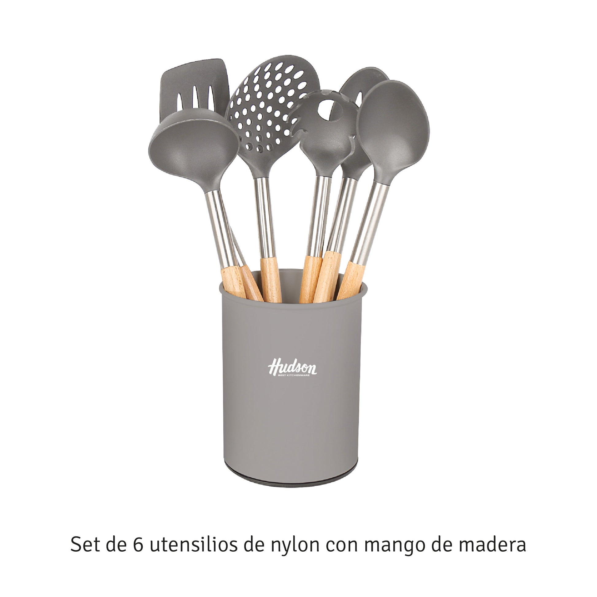 Comprando esta publicación obtienes un SET DE 6 UTENSILIOS DE NYLON CON EL HOLDER DE COLOR GRIS CON MANGO DE MADERA. Espumadera, Espátula, Cucharon, Cuchara, Cuchara para Pastas, Cuchara Calada.